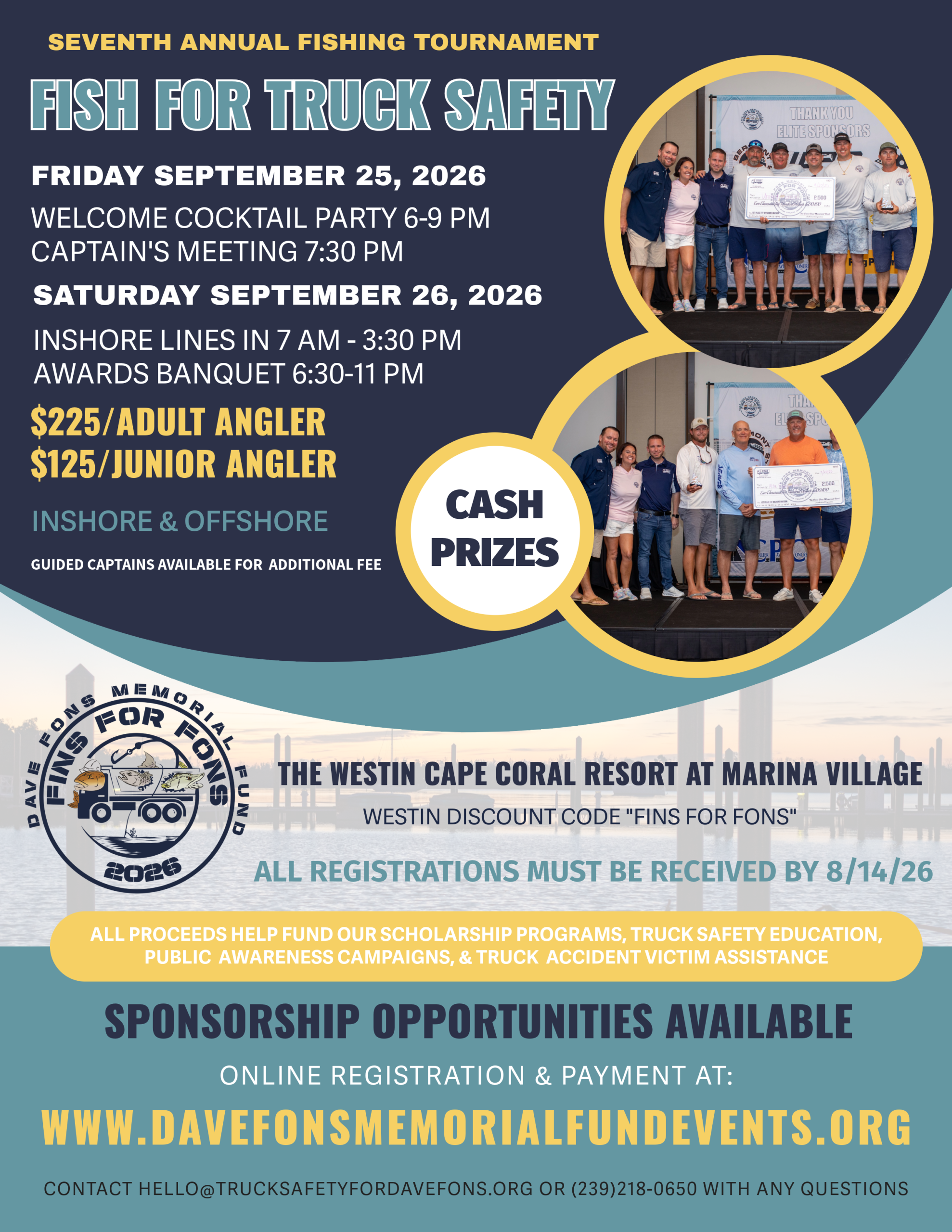 TOURNAMENT DAY: INSHORE LINES IN 7:00 AM-3:30 PM, AWARDS BANQUET 6:30 PM-8:OO PM, AND AFTERPARTY 8:00-11:00 PM AT THE WESTIN CAPE CORAL ON SEPTEMBER 26, 2026