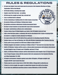 COST: $225 PER ADULT ANGLER & $125 PER JUNIOR ANGLERS (15 AND UNDER) WHICH INCLUDES ENTRY INTO THE TOURNAMENT, TICKET TO THE COCKTAIL PARTY, CAPTAIN’S DINNER, AND AWARDS BANQUET. INSHORE GUIDED CAPTAINS CAN BE RESERVED FOR AN ADDITIONAL FEE OF $950. ALL ANGLER REGISTRATIONS MUST BE RECEIVED BY 8/15/26.